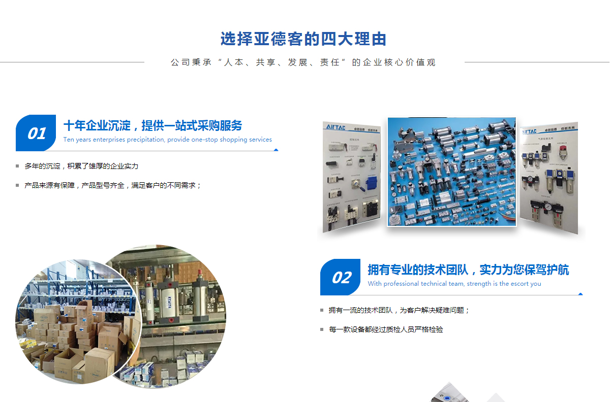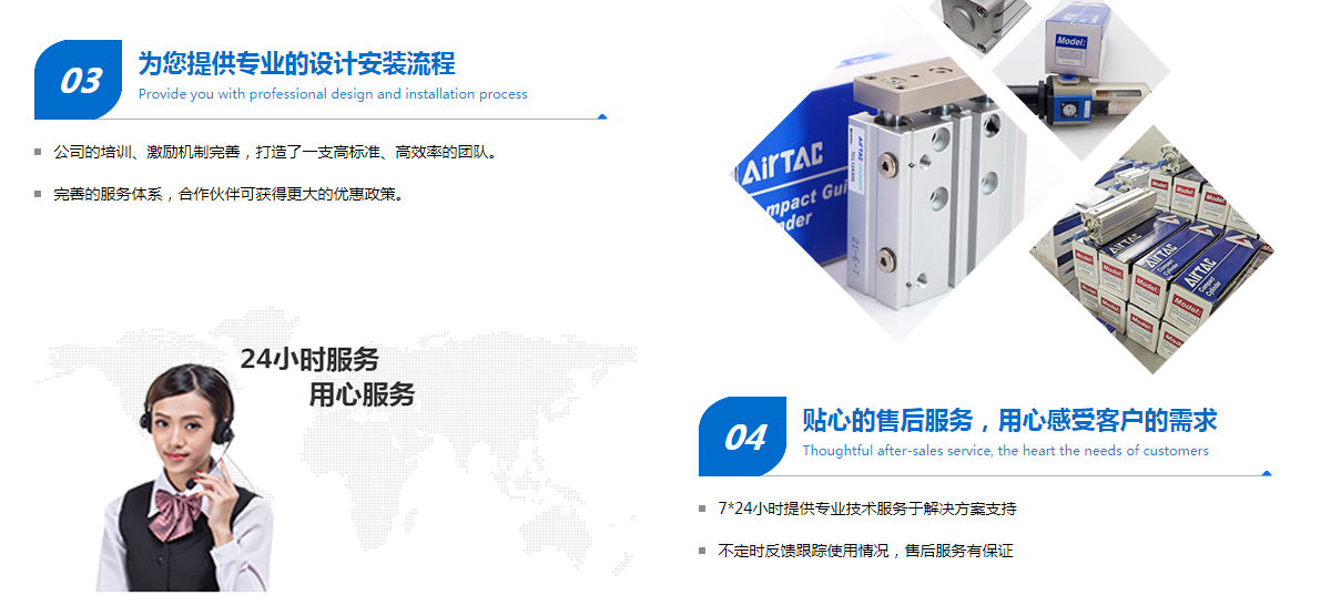 天津中工科进智能装备有限公司自成立以来,依托优越的地理优势,立足三北,辐射全国,形成了稳定的销售网络,公司专业从事台湾亚德客AIRTAC品牌气动元件,北方地区的销售及售后服务等。产品包含:亚德客AIRTAC气动元件,亚德客AIRTAC气缸,亚德客AIRTAC电磁阀,亚德客AIRTAC气控阀,亚德客AIRTAC气动旋转夹爪,亚德客AIRTAC过滤器,亚德客AIRTAC夹紧气缸,亚德客AIRTAC气动机械夹爪,亚德客AIRTAC真空吸盘,亚德客AIRTAC接头气管辅助元件等。公司团队立足于气动领域内的技术咨询、技术服务,设有专门的销售服务部,拥有完善的销售服务体系,可在售前、售中和售后的各个环节为用户提供全面服务,为您解决气动方面各项疑难问题。